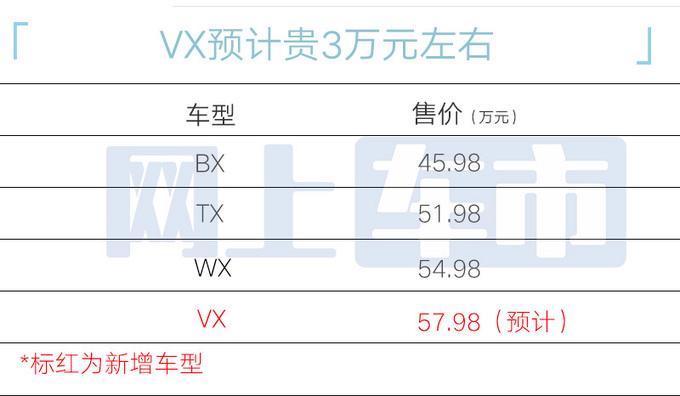 新车将在2月26日上市,前脸采用直瀑式前格栅,升级JBL音响、大灯清洗、20英寸轮毂、冰箱、全景天窗、流媒体后视镜、前后专属扰流板等。销售透露,新车预计卖57-58万,比WX版贵3万左右。